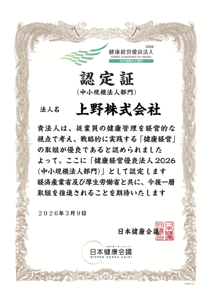 上野株式会社は、社員の心身両面の健康維持・増進が、当社の持続的な成長と社会への貢献に重要であると捉え、社員一人ひとりが「心と身体の豊かさ」を持ち、いきいきと積極的に仕事に取組むことができる職場環境の整備に向けて健康経営を推進して参ります。 また、働き方改革に意欲的に取組み、ワークライフバランスの実現により生産性の向上と組織の活性化を図り、地域社会と共に成長して参ります。