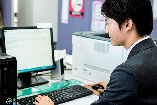 1日中お客様先を訪問しているため、始業時間の30分前には出社してデスクワーク。メールチェックをはじめ、売上やFAXで届いた注文、受注票の確認をしているとあっという間に時間がすぎる。