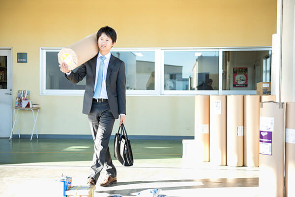 新しい見本帳が出ると、それを既存のお客様にPRしに行くなどが主な仕事。まずはその日に必要な資材などを社用車に積んで出発する。1日で訪問する件数は平均10件程度。「お客様と話しているとすぐに時間が経ってしまうし、お客様によってタイプが全く異なるので、たくさん回って大変という感じはないですね。親しくさせていただいているお客様も多く、食事をご一緒することもあります」