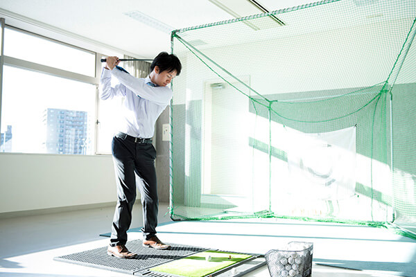 ラーメンやパンなど、さっと食べられるランチが多め。食後に時間の余裕がある時は、社内にある練習スペースでゴルフの練習をすることも。「社会人になってゴルフを始めました。社内の人ともお客さんともラウンドするので、少しでも上達したいと思ってちょこちょこ練習しています。それに体を動かすといいリフレッシュになって、午後からの仕事も気合が入ります」