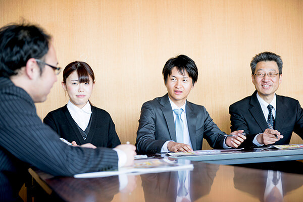 お客様の訪問から帰社後、課内の人たちとミーティング。現状の報告や課題などをあぶり出し、上司から今後の仕事に役立つアドバイスをもらうことも。「先輩たちはみんな仕事熱心で、僕の経験だけでは思いつかない気付きをくれることもしばしば。また入社年数に関わらず裁量権を与えてくれるため、自分のしたいことを反対されることがあまりなく、仕事が進めやすいですね」